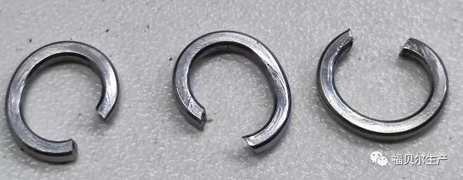 4、彈簧墊圈的切口毛刺:由于加工工藝的原因,切斷面后的彈簧墊圈切口處肯定存在或大或小的毛刺,彈簧墊圈經(jīng)過熱處理后,這些帶有較高硬度的毛刺或?qū)⒅苯忧度肫綁|圈或被連接件機(jī)體中,導(dǎo)致螺栓螺母擰緊過程中彈簧墊圈拉長(zhǎng)而墊圈失效。